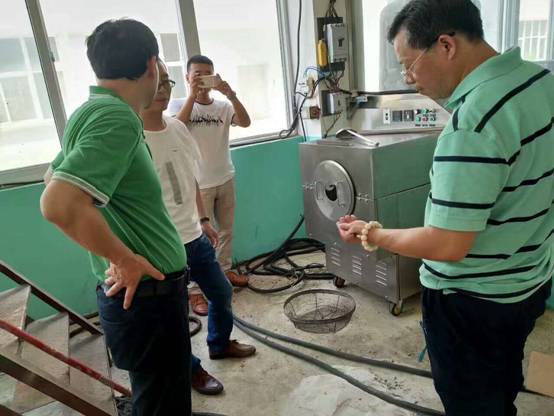 加拿大客户来许昌智工考察智能环保型多功能电磁炒货机!现场试炒澳洲进口坚果!